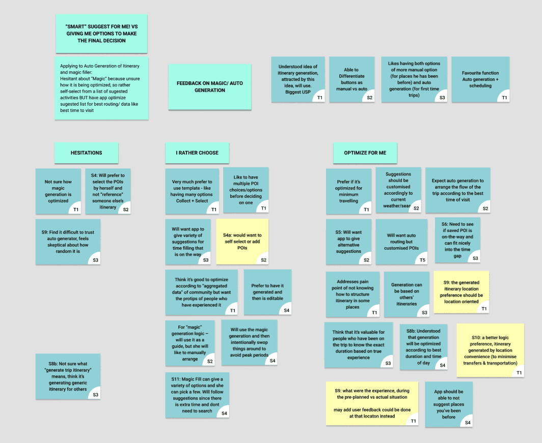 A first round of user testing was conducted with five participants across varied ages and nationalities. Participants responded positively to the different itinerary views, validating the core concept. Feedback also revealed a desire for greater flexibility and customisation after an itinerary was generated.