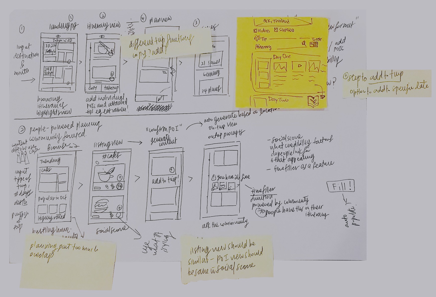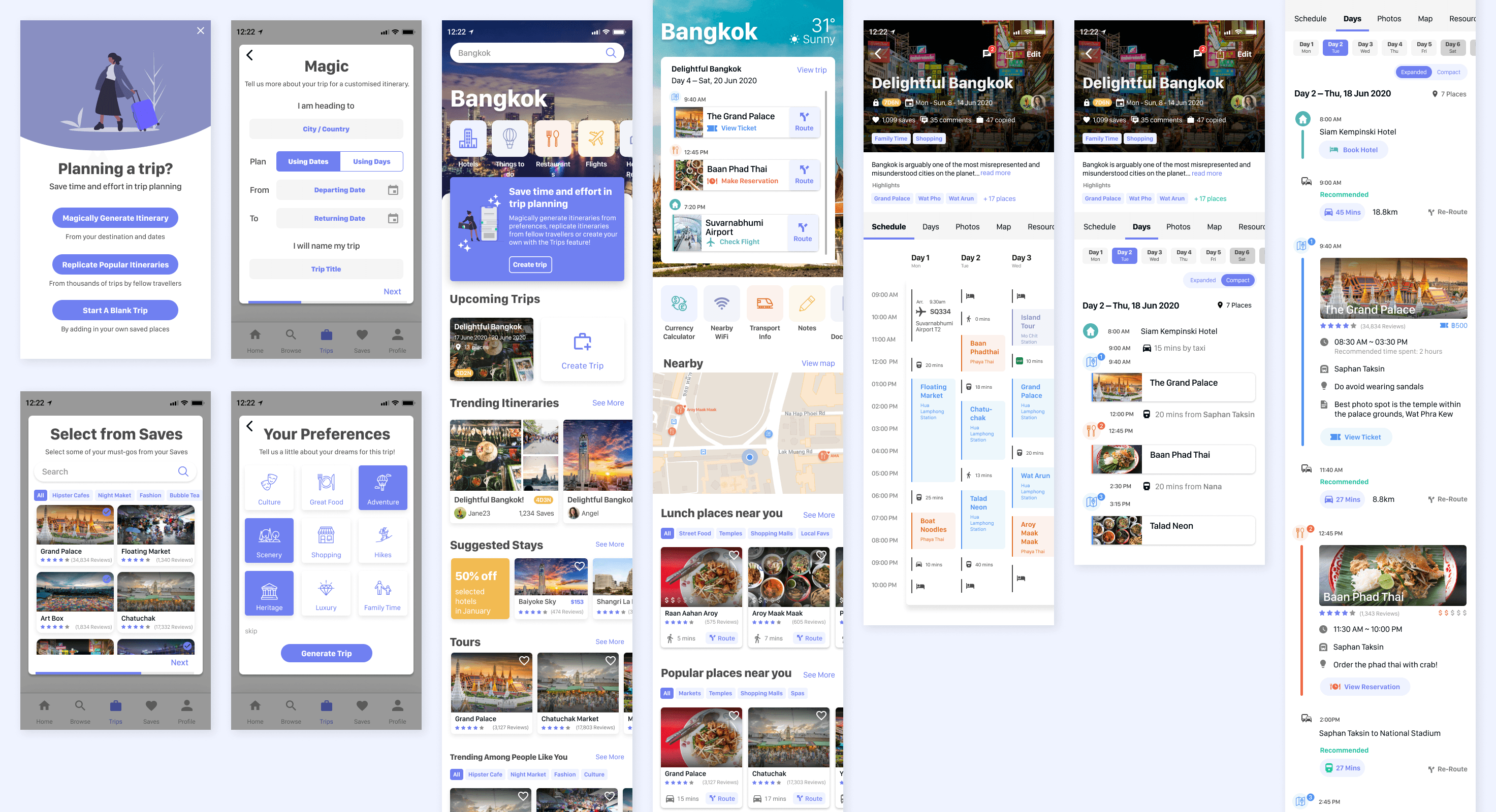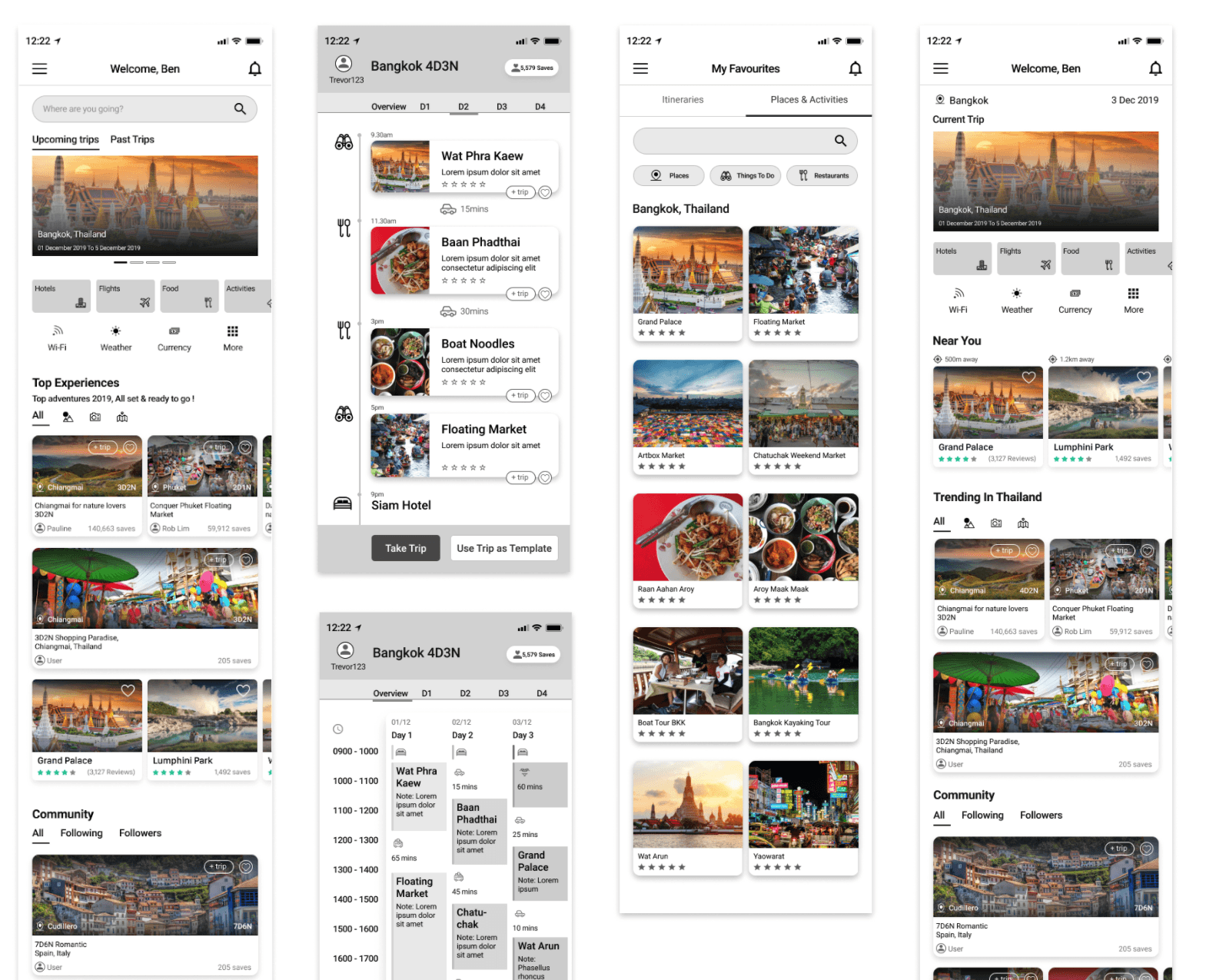 Based on insights from the first round of user testing, we refined the prototype to improve content organisation and increase flexibility in itinerary customisation. We also introduced a dedicated on-trip homepage to better support users while on their trip, and explored additional social features for testing.