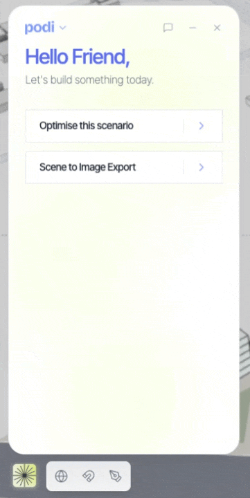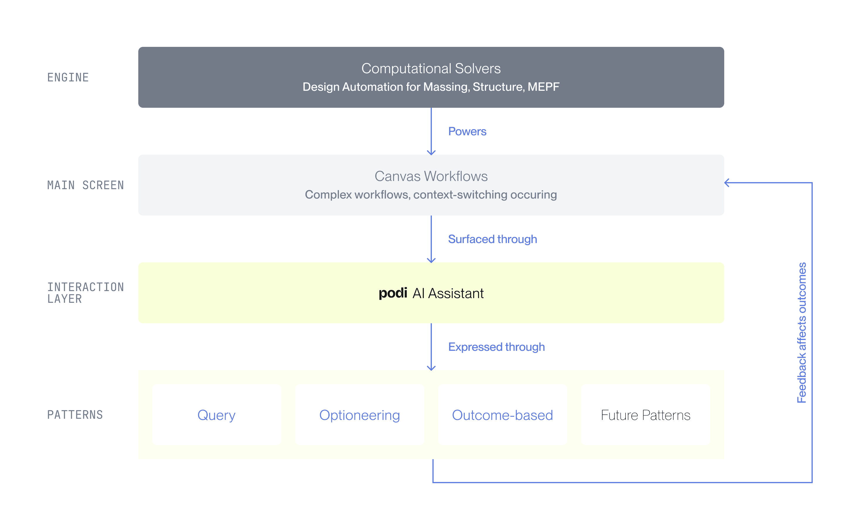Podium is a design automation platform powered by computational solvers that generate building designs, from site massing down to structural detail. As the platform grew, so did the complexity of its workflows. Much of this computational power remained fragmented, difficult to access, and hence underutilised. Insights from user feedback revealed recurring pain points: • New users struggled to discover relevant capabilities • Power users encountered friction from long load times mid-workflow • Exploring options required repeated back-and-forth, breaking momentum Obvious fixes like onboarding flows and wizards could address discoverability, but not the deeper problems around non-linear workflows. This presented an opportunity to utilise AI to allow users to actively interrogate and iterate on the platform's computational intelligence within their workflows.