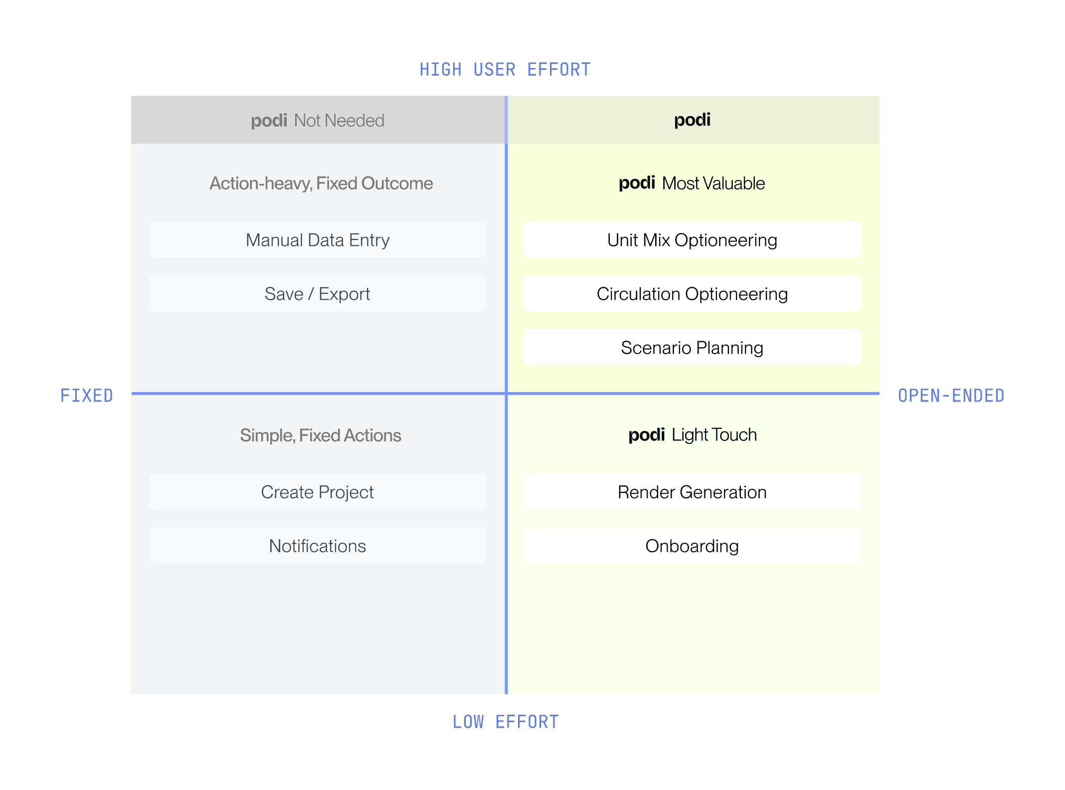 For open-ended workflows with multiple valid outcomes, Podi becomes valuable to support iteration and decision-making.
